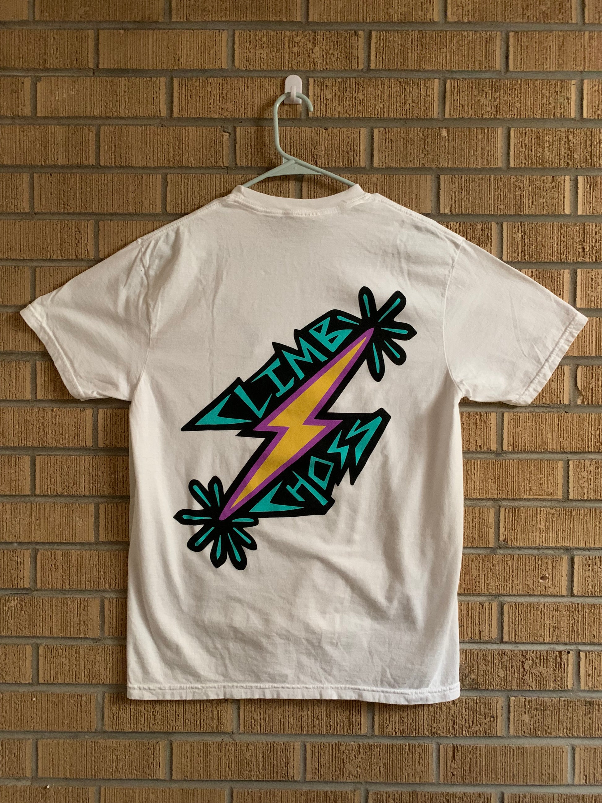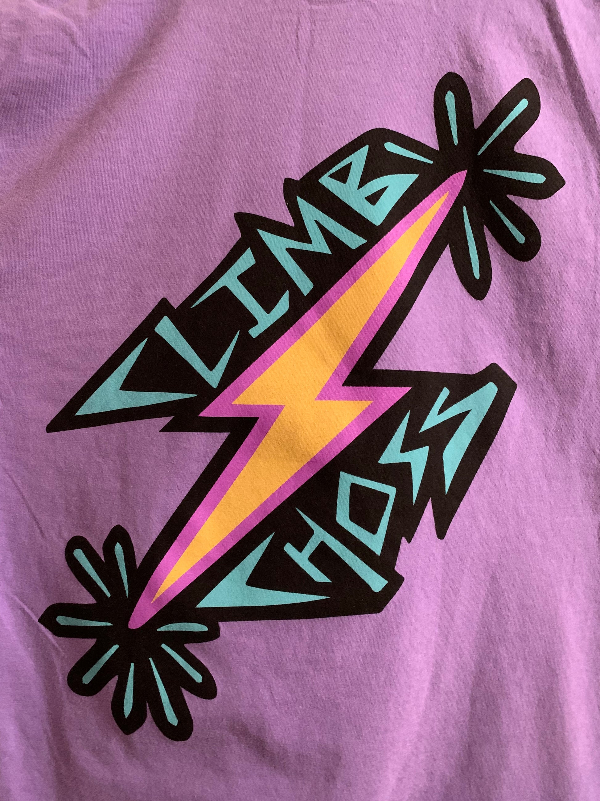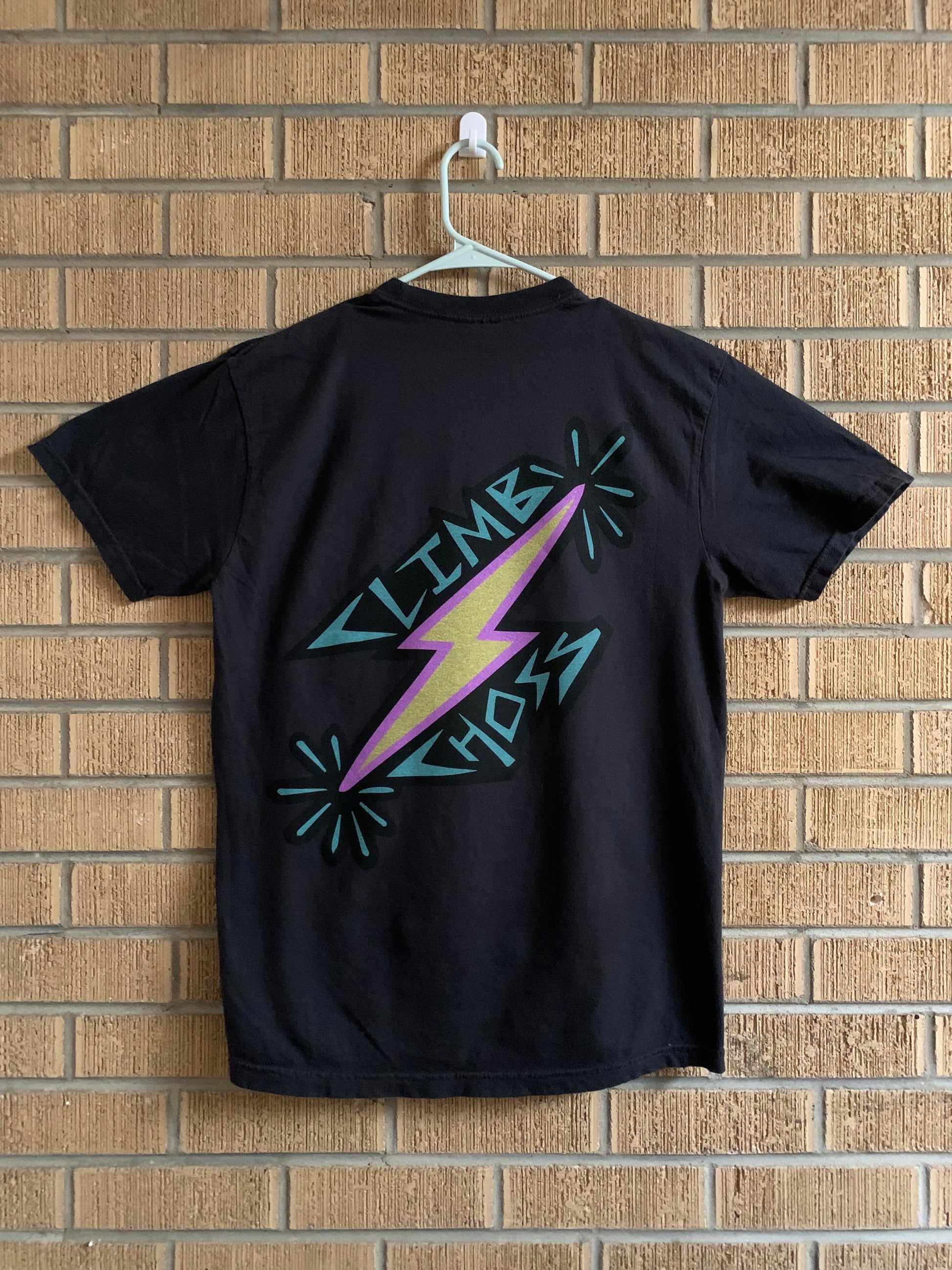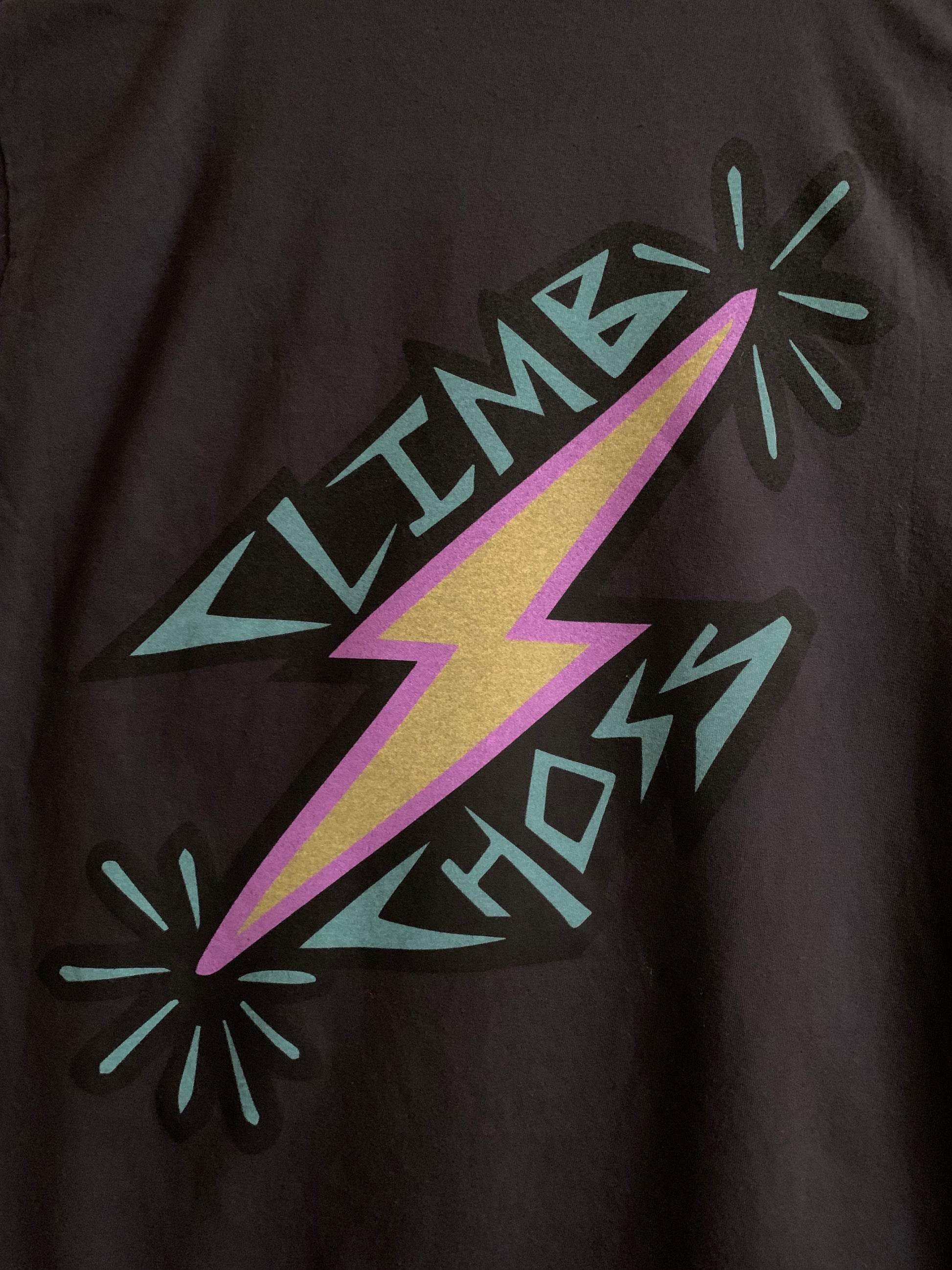 A comfy, 6.1 oz, heavyweight, garment dyed, cotton shirt with the Choss lightning bolt embroidered on the front L chest and the Climb Choss design screen printed big on the back.
