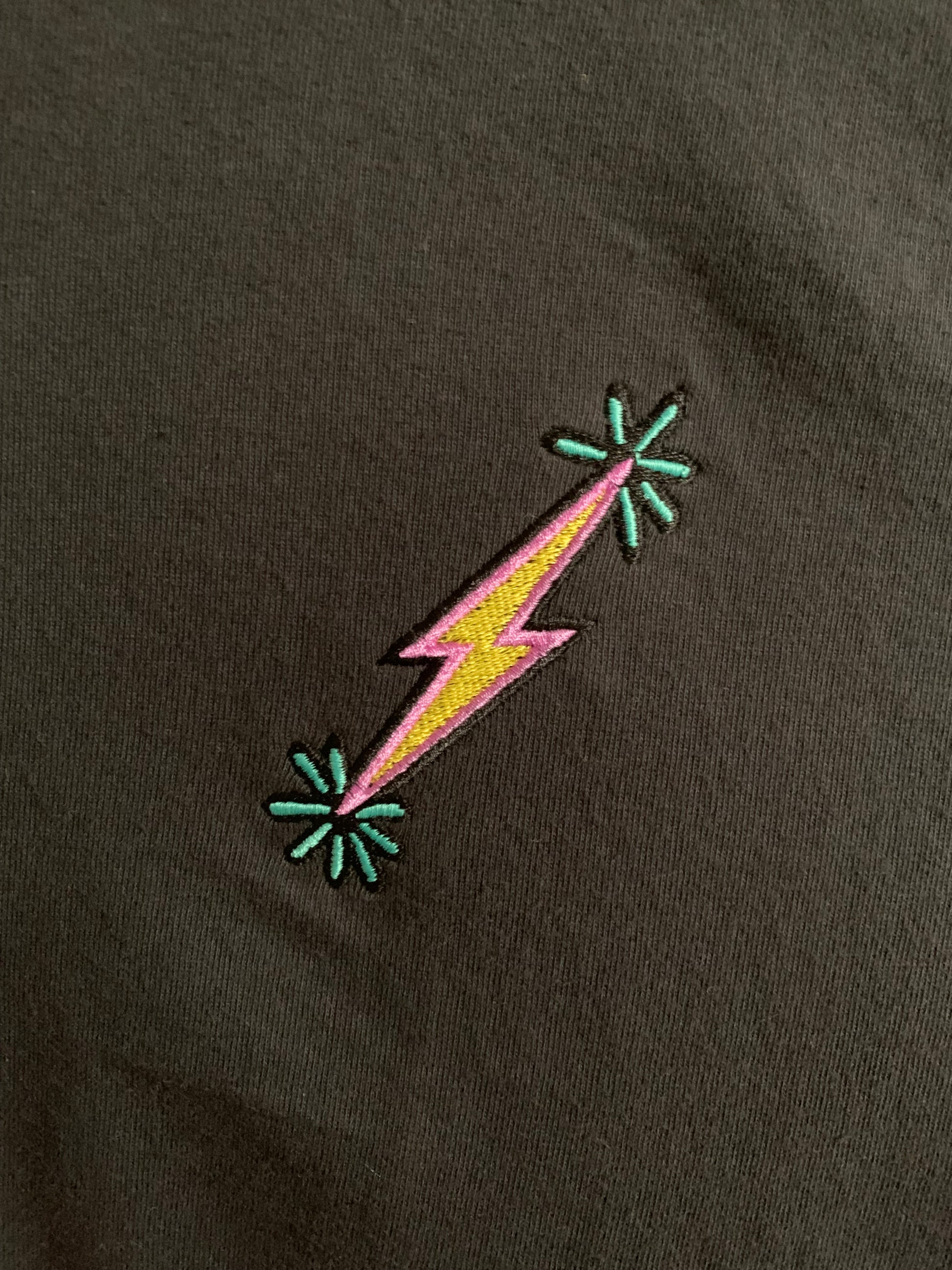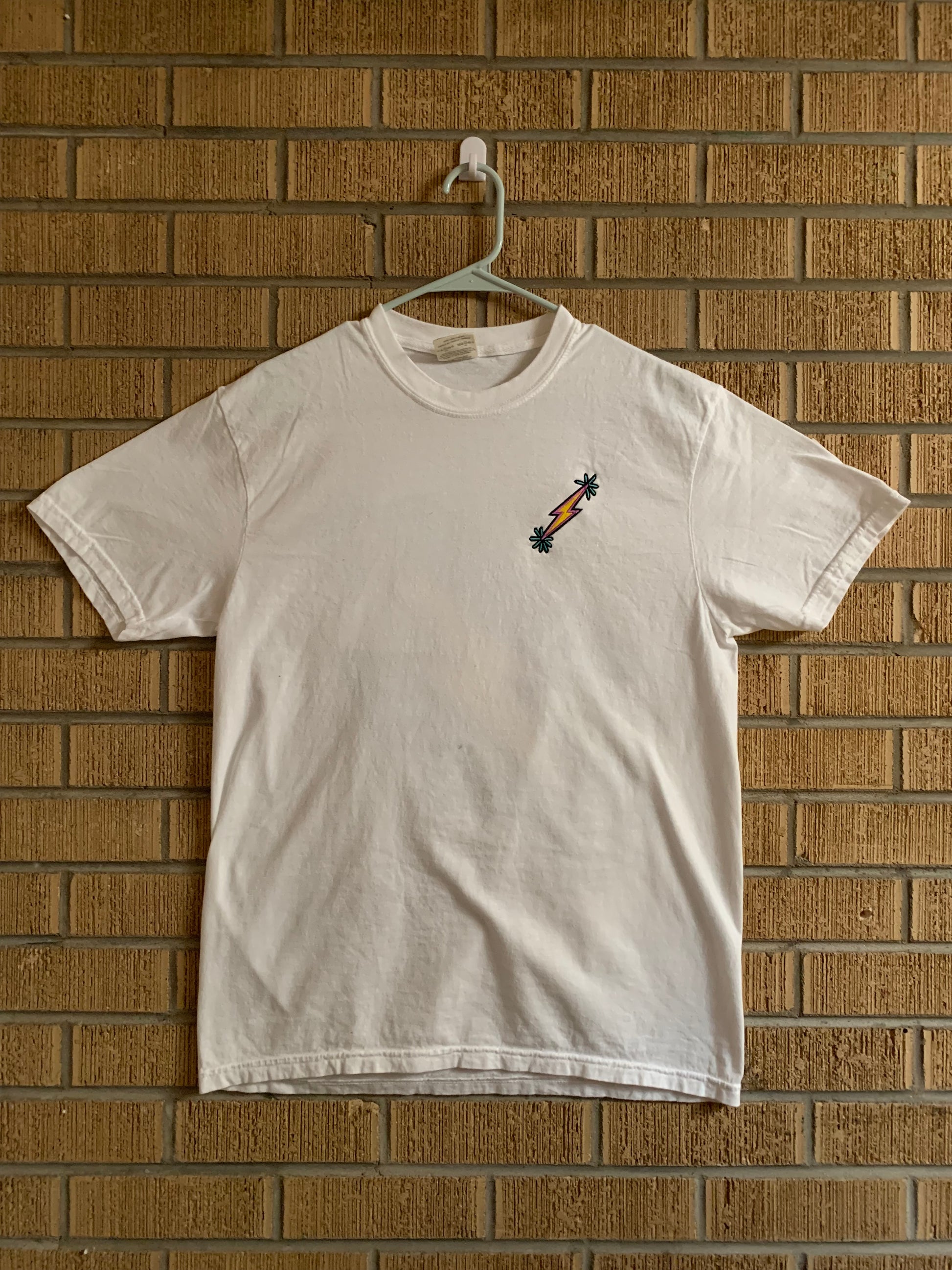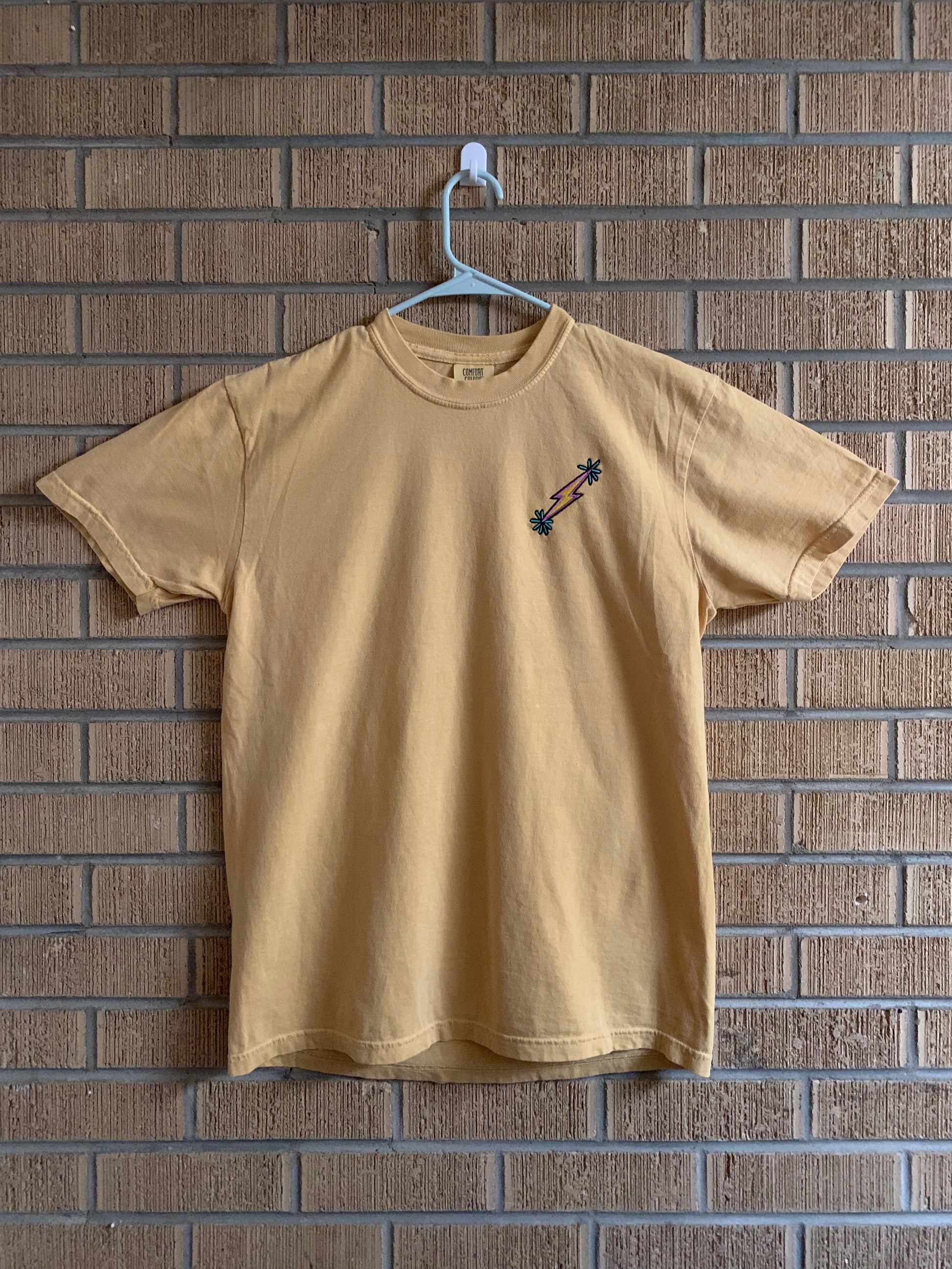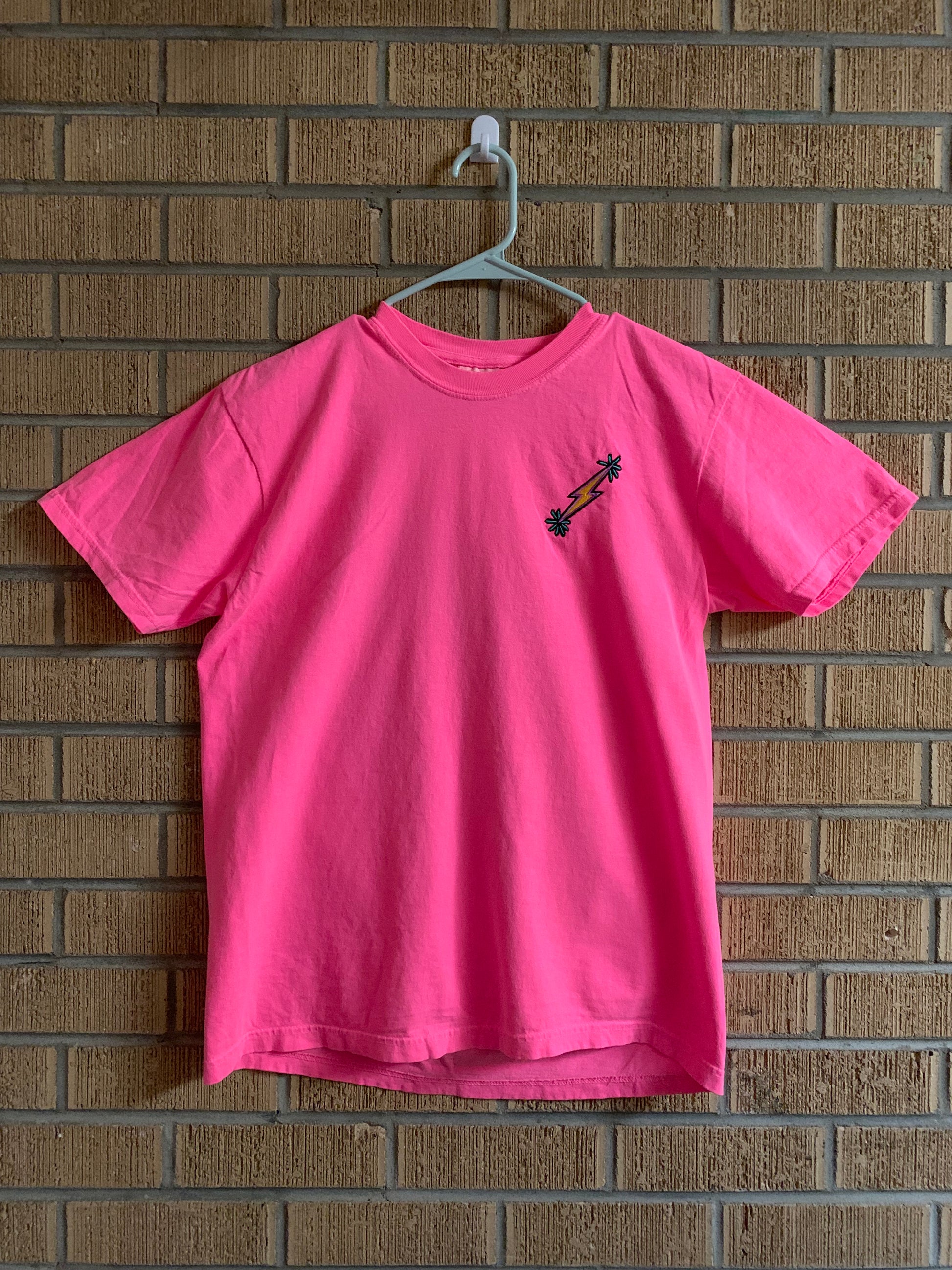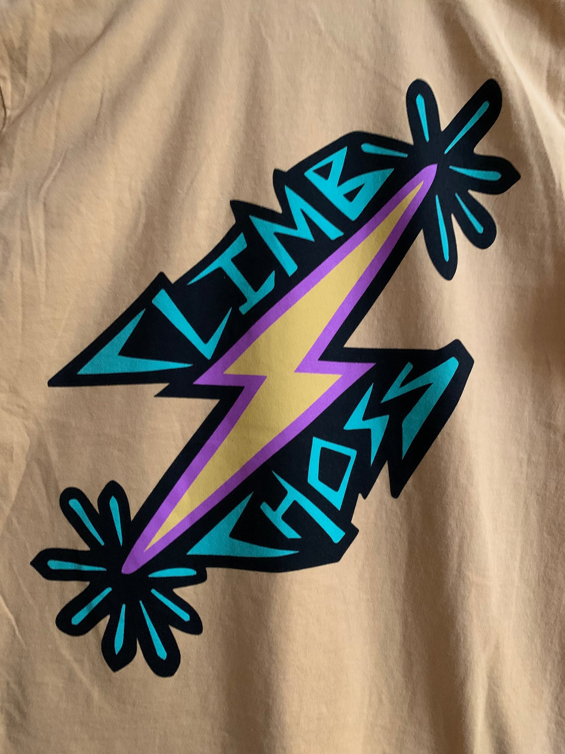 A comfy, 6.1 oz, heavyweight, garment dyed, cotton shirt with the Choss lightning bolt embroidered on the front L chest and the Climb Choss design screen printed big on the back.
