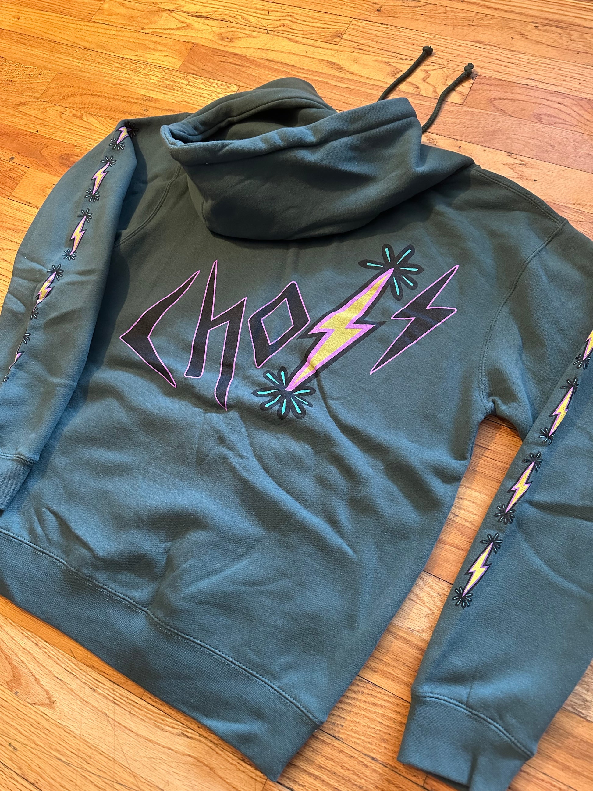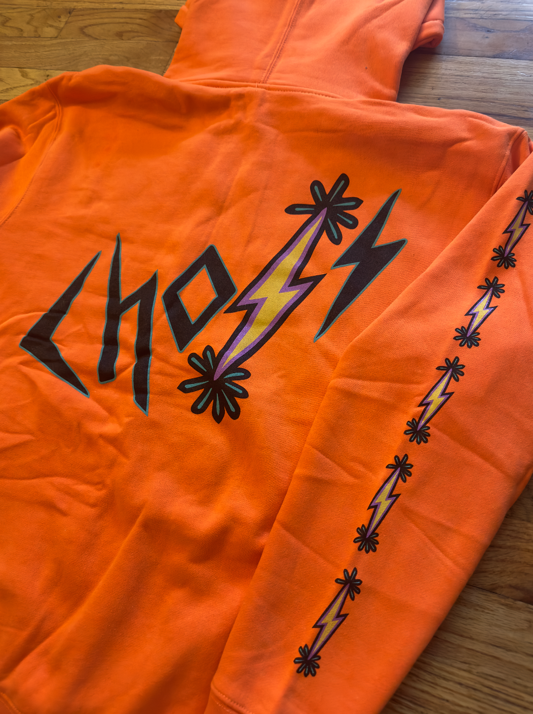 Thick, durable, fleeced lined, 10 oz pullover hoodie with the Choss logo screen printed big on the back, the Climb Choss design embroidered on the front L chest, and the Choss lightning bolts screen printed on both sleeves.