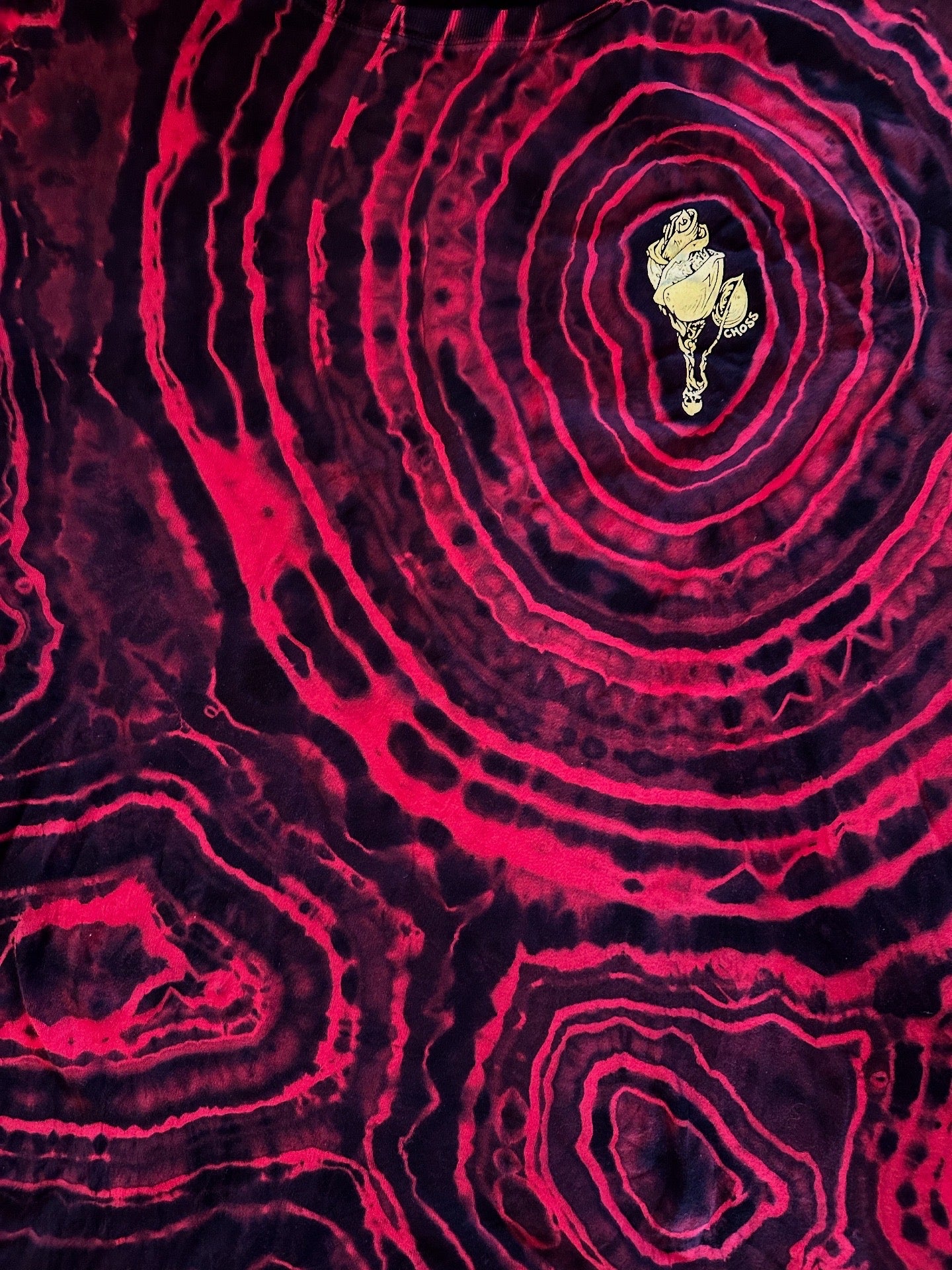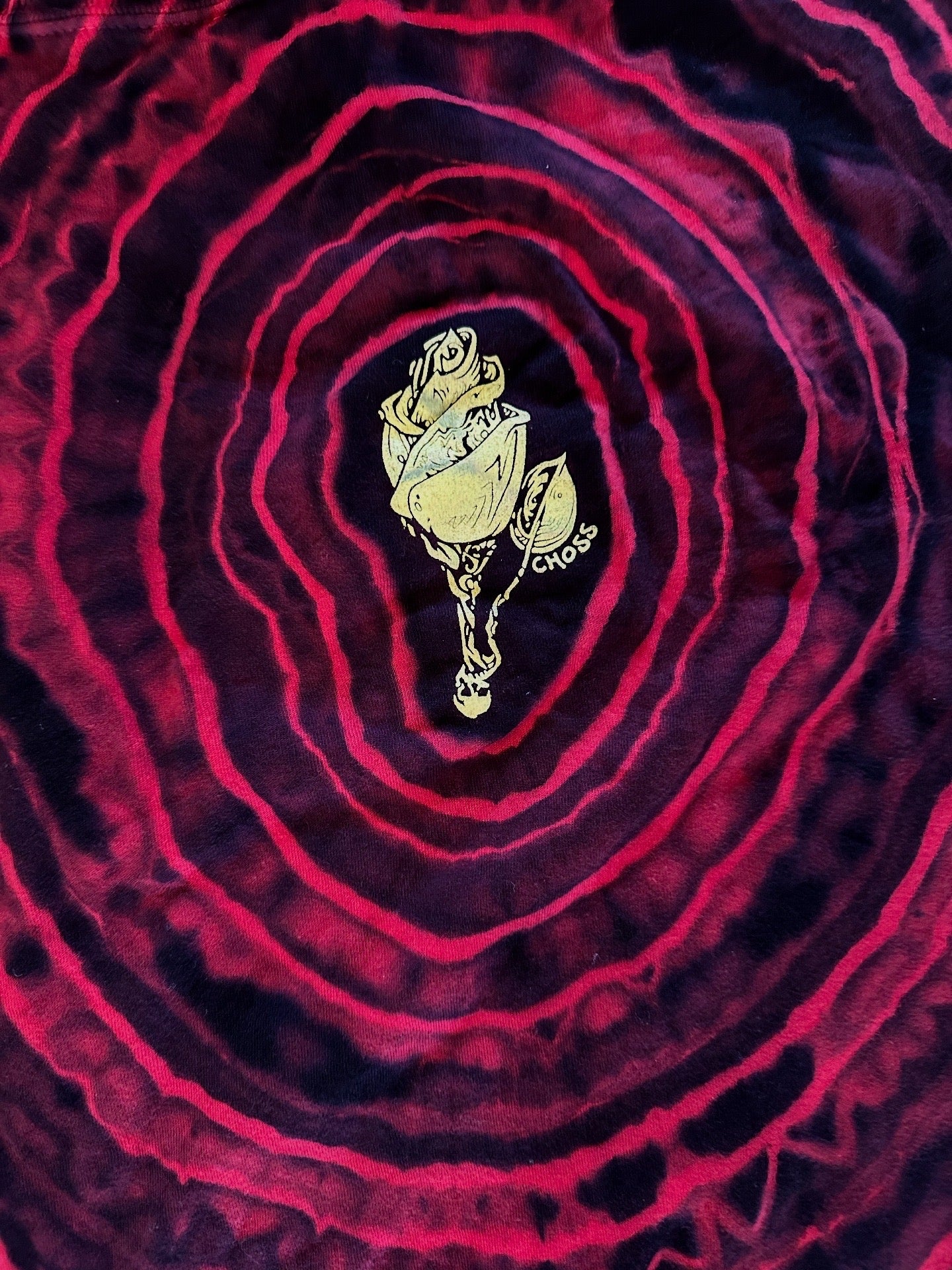 Hand-dyed, one-of-a-kind, 100% U.S. grown cotton tee with the "Rose Bud" design screen printed on the front L chest, the "Rose Move" design screen printed large on the back and now with the new Choss lightning bolt hem tag.