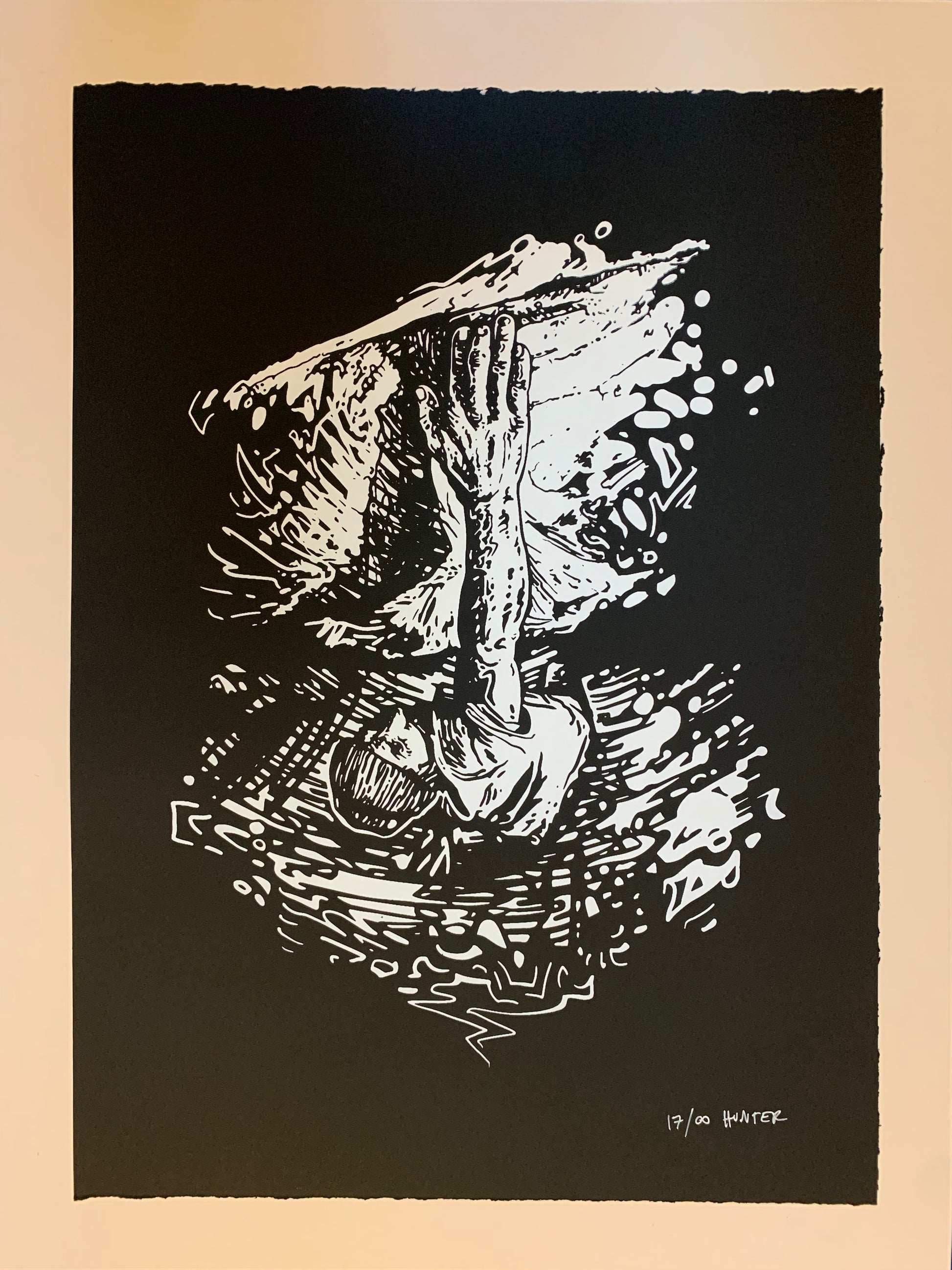 Hand screen printed with white ink on 15"x21" black paper (deckled edges). Numbered and hand signed by the artist Hunter Damiani.
