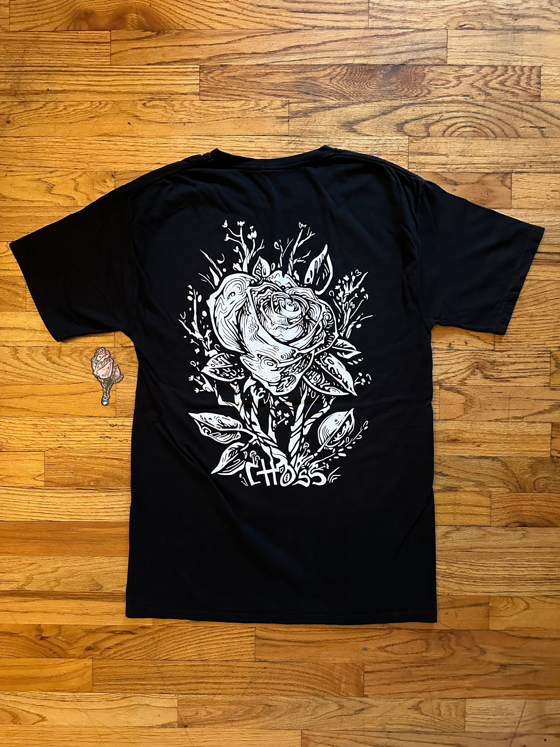 100% U.S. grown cotton tee with the "Rose Bud" design screen printed on the front L chest, the "Rose Move" design screen printed large on the back and now with the new Choss lightning bolt hem tag.